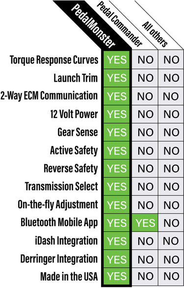 PedalMonster is unlike throttle response controllers like Pedal Commander, Sprint Booster, and others that crudely manipulate pedal position. PedalMonster utilizes real-time powertrain data to calibrate torque delivery. Competitors have no such connectivity or safety features, treating all vehicles and situations the same.