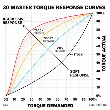 PedalMonster improves take-off and mid-range punch by reshaping your vehicle's torque delivery with 30 selectable Master Torque Response Curves: City, Sport, and Track, each with its own 5-position Launch Trim, active below 10 MPH.
